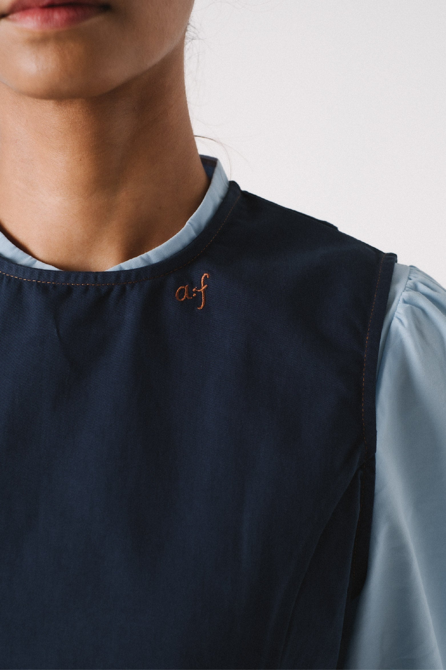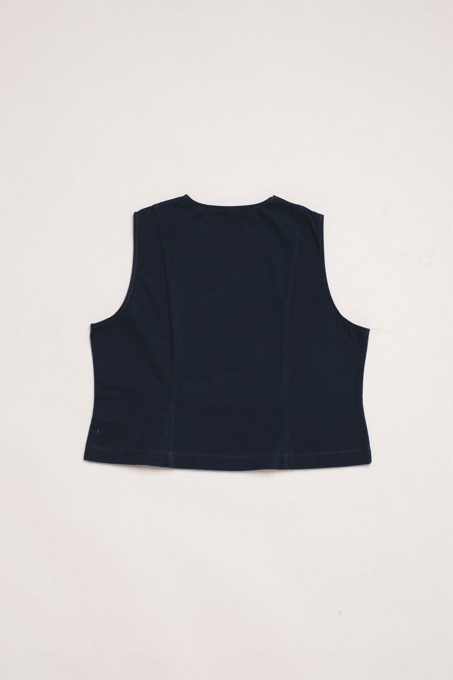 The Color Me Blue vest is a beautifully constructed boatneck vest in a dark, calm shade of navy blue.
