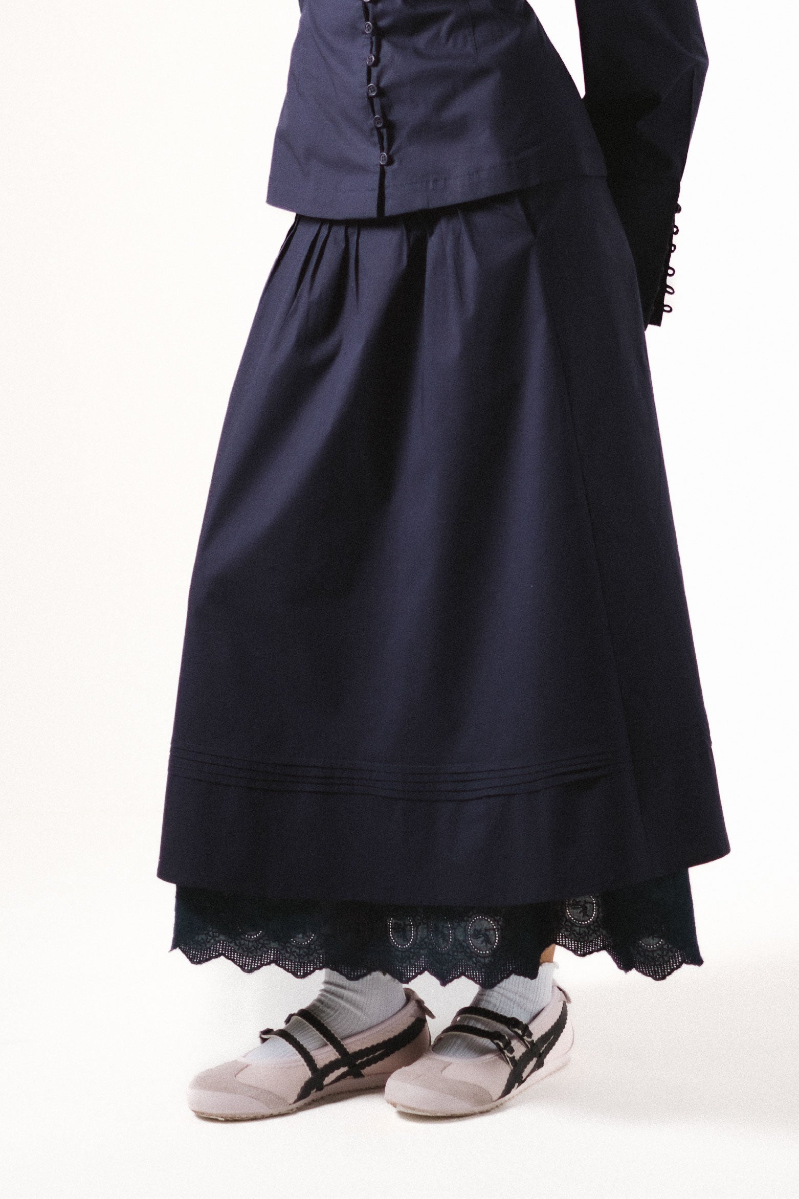 Crafted in crisp navy cotton poplin, this double-layered skirt is sure to add a spring in your step. The pleated details add texture, while the inline lace hem offers a subtle reveal. A soft elastic waistband allows for extra comfort — and if you're wondering: yes, it has pockets.