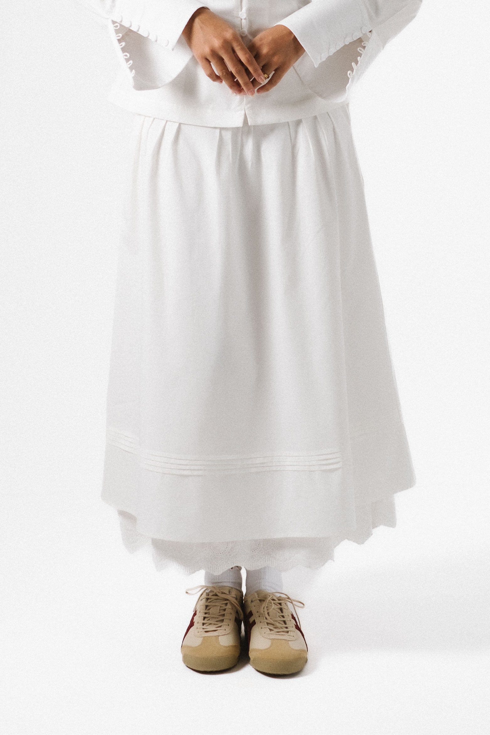 Crafted in crisp white cotton poplin, this double-layered skirt is sure to add a spring in your step. The pleated details add texture, while the inline lace hem offers a subtle reveal. A soft elastic waistband allows for extra comfort — and if you're wondering: yes, it has pockets.
