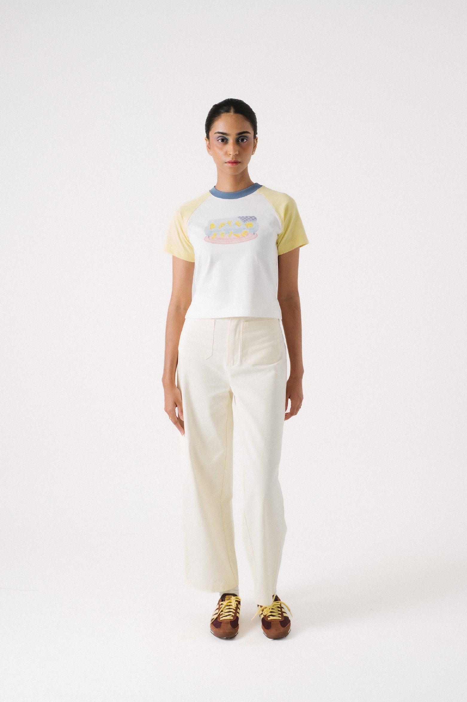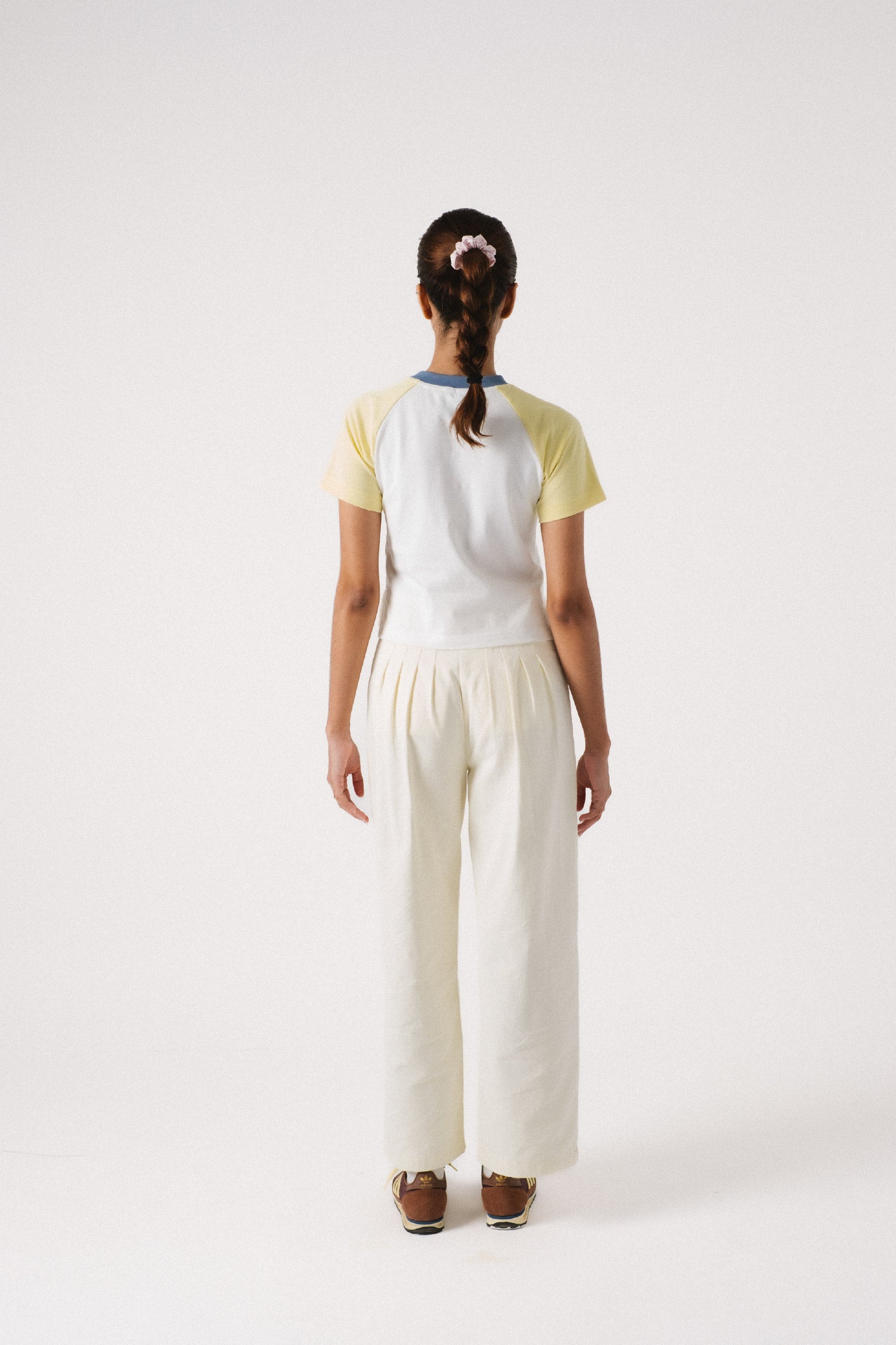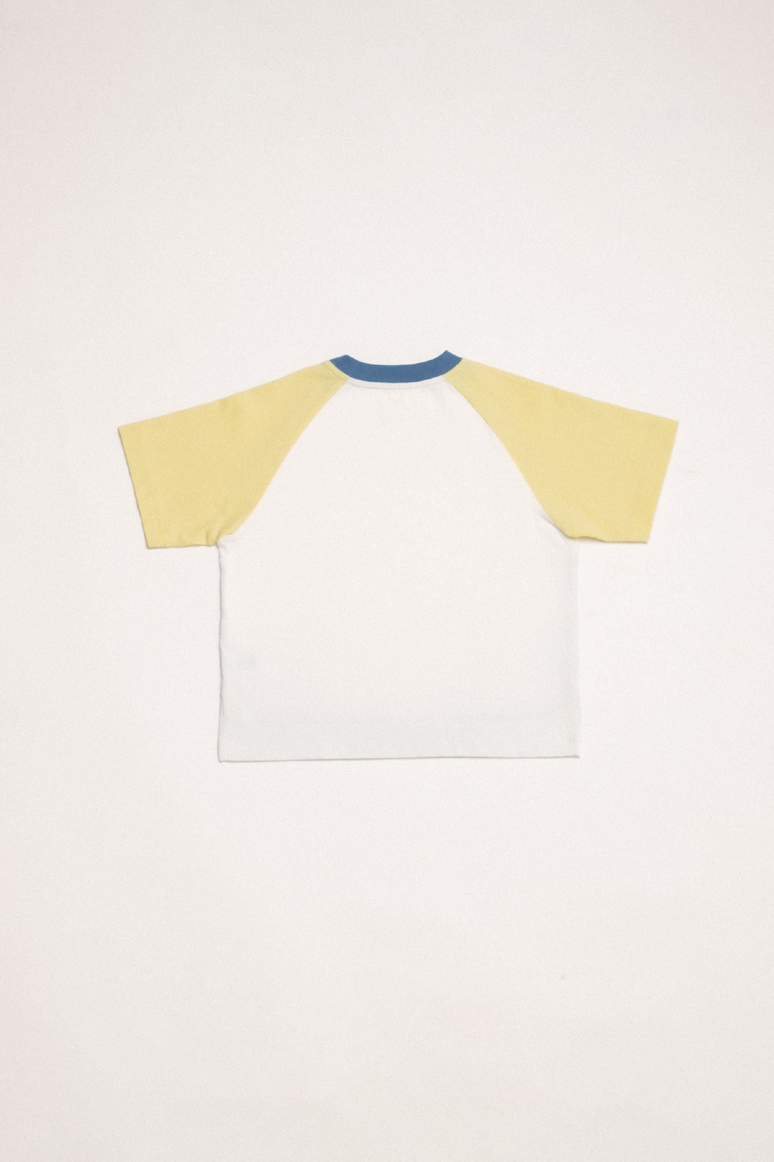 The In Reverie Tee is used exactly as its name intends—an invitation to drift, dream, and unwind. This raglan tee comes with a ribbed blue neckline and yellow sleeves to perfectly contrast the blue collar and white shirt body.