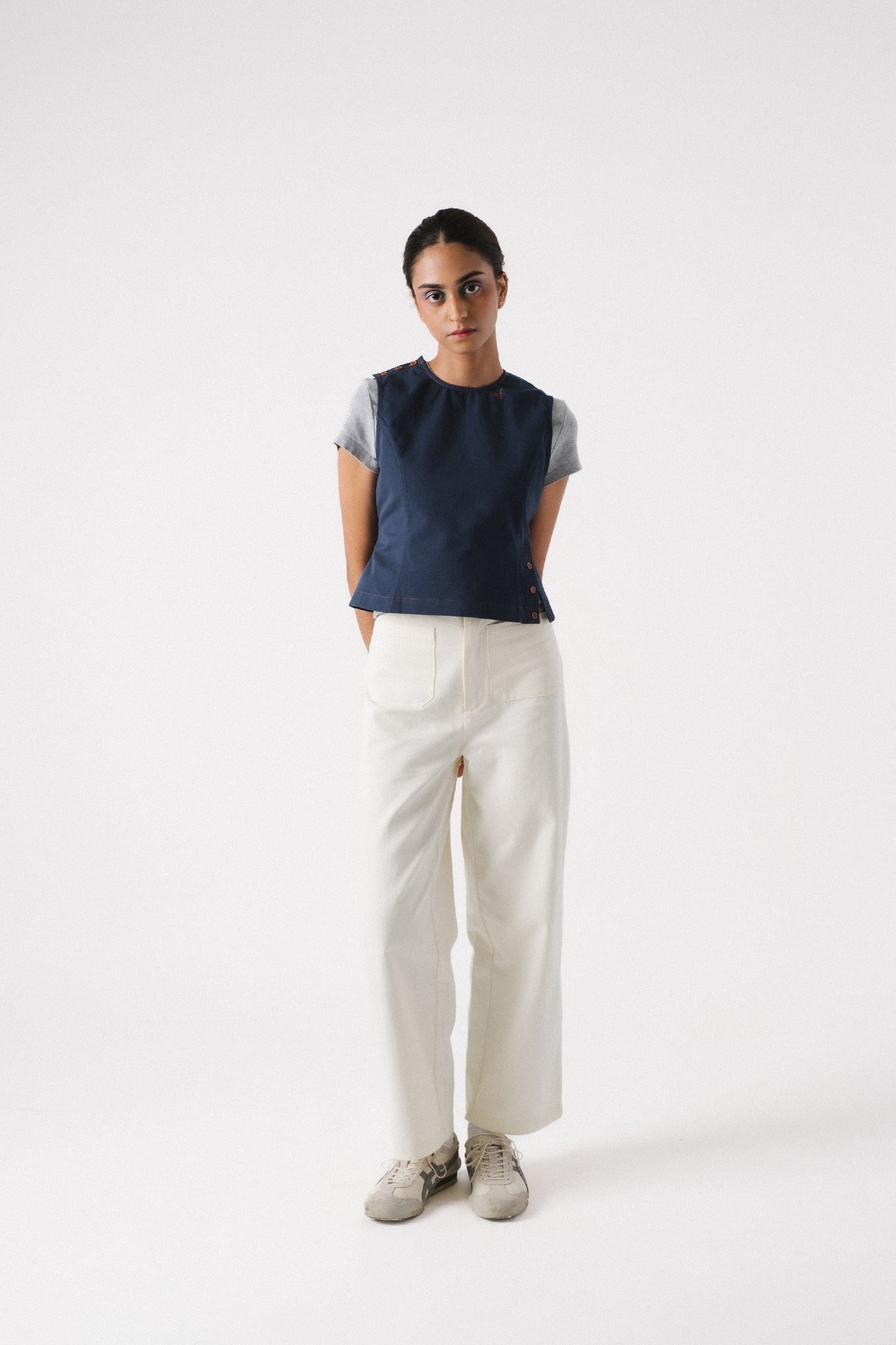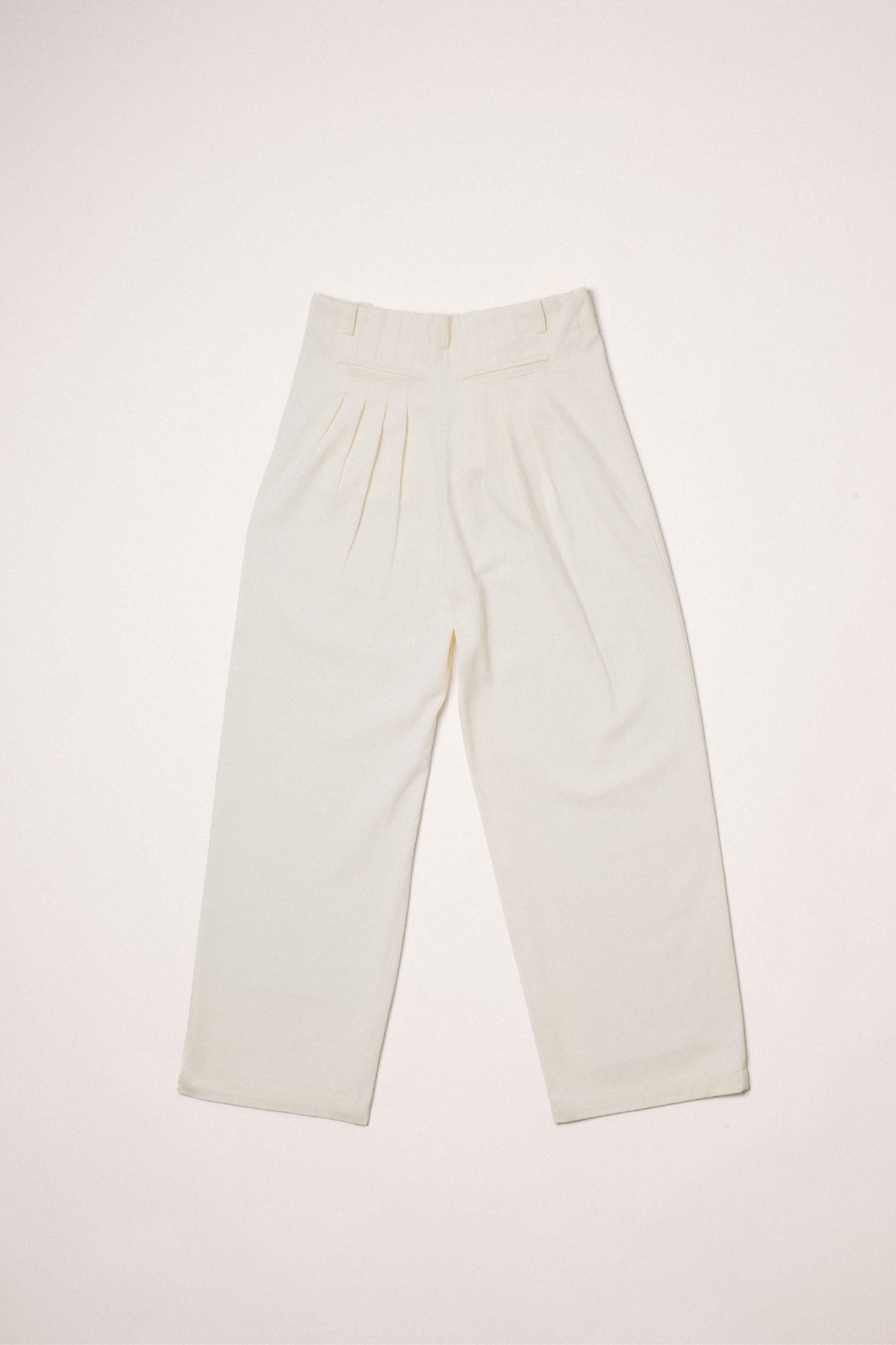Available (for the time being) in cream white, this thick cotton jeans comes with two small pockets in the front fitted with hidden zips and buttons.